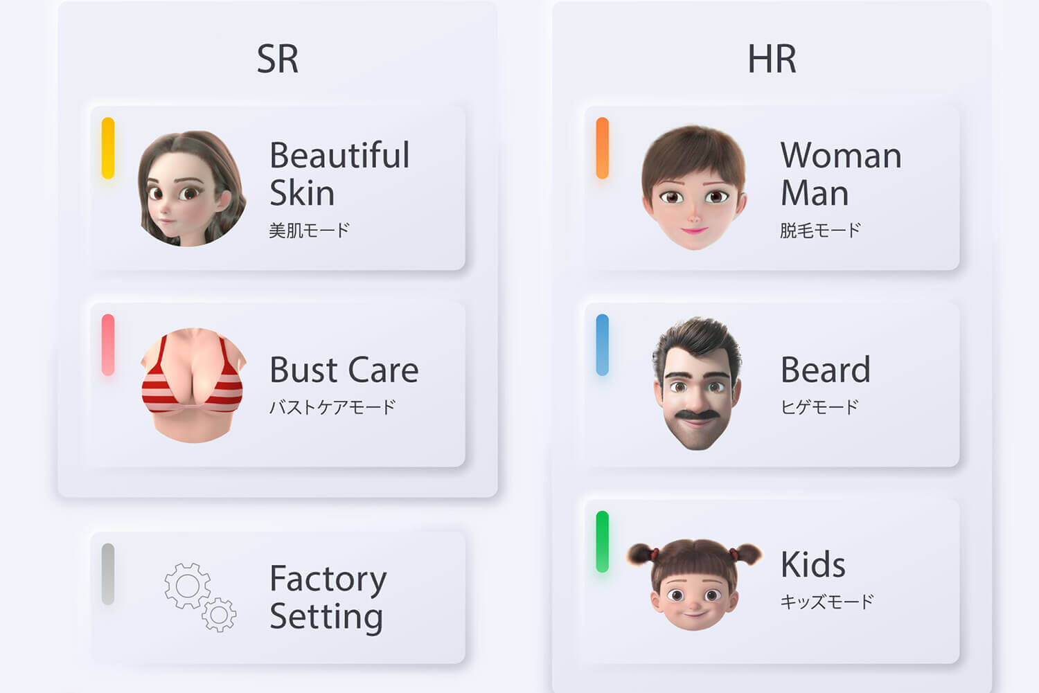 脱毛・ヒゲ・キッズ・美肌・バストの5つの専用モードを、ワンタッチで簡単に切り替えることができます。